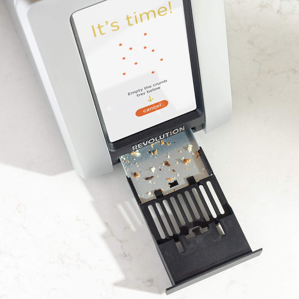 - "Time to clean" onscreen crumb tray notification